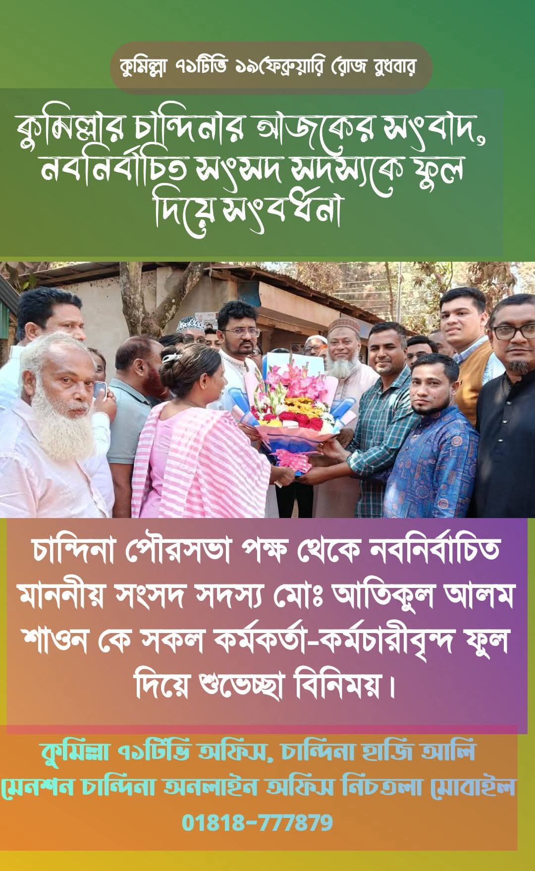 চান্দিনা পৌরসভা পক্ষ থেকে নবনির্বাচিত মাননীয় সংসদ সদস্য মহোদয় মোঃ আতিকুল আলম শাওন সাহেবকে সকল কর্মকর্তা-কর্মচারীবৃন্দ ফুল দিয়ে শুভেচ্ছা বিনিময় করেন।